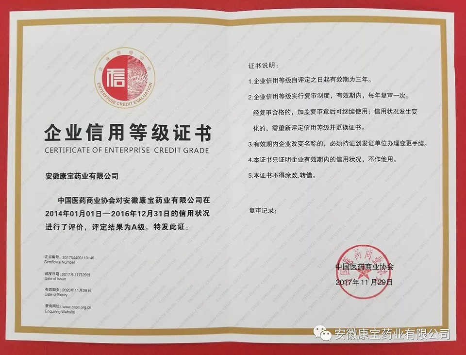 信以為本 “誠”就卓越--安徽康寶藥業有限公司榮獲A級企業信用評