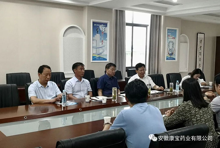 6月23日上午,淮南市政府副秘書長聶友俠、淮南市商務局局長梁廣賢、淮南市大通區常務副區長明冠雷、淮南市市場中心主任童志友、大通區商務局副局長江萍,來到康寶藥業走訪調研。康寶藥業董事長朱興林熱情接待了各位領導并陪同調研。