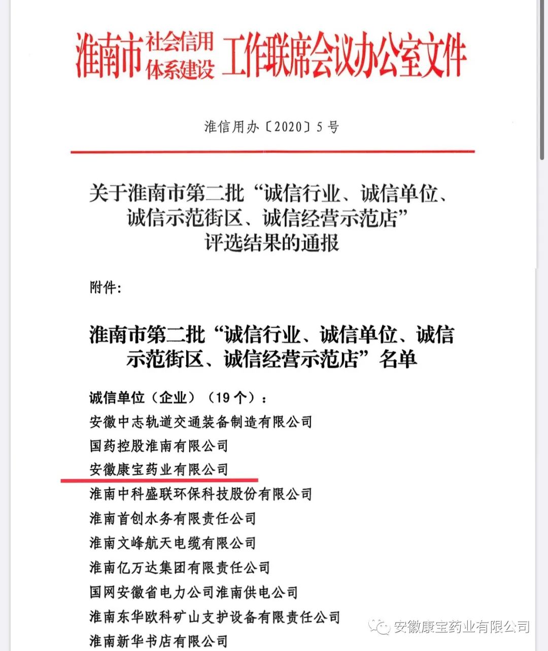 【請您關注】康寶藥業喜獲“淮南市誠信單位”榮譽稱號